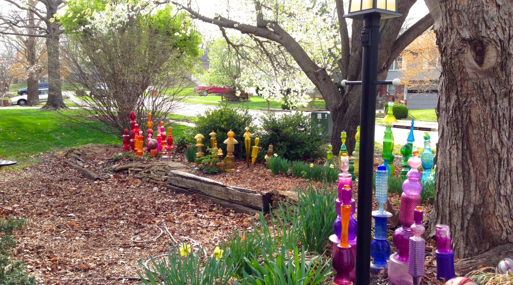 It’s spring here in Kansas, and I’m itching to get outside in my garden. The glass totem installation in the front yard has been looking a bit catty-wampus after it’s third winter, and it’s time to get out there and set things to right. I’ve been amazed I haven’t lost any of my totems to our extreme weather. I’ve never had a piece of glass break, even through a couple of moderate hailstorms, but I do have a couple of pieces that have come apart at the seams and need to be re-glued. A couple have fallen victim to some of the littles in the neighborhood. One little boy (about two?) walked up to a totem, reached out and before his mom or I could redirect, snapped off the finial at the seam. No matter. It’s easily reattached.