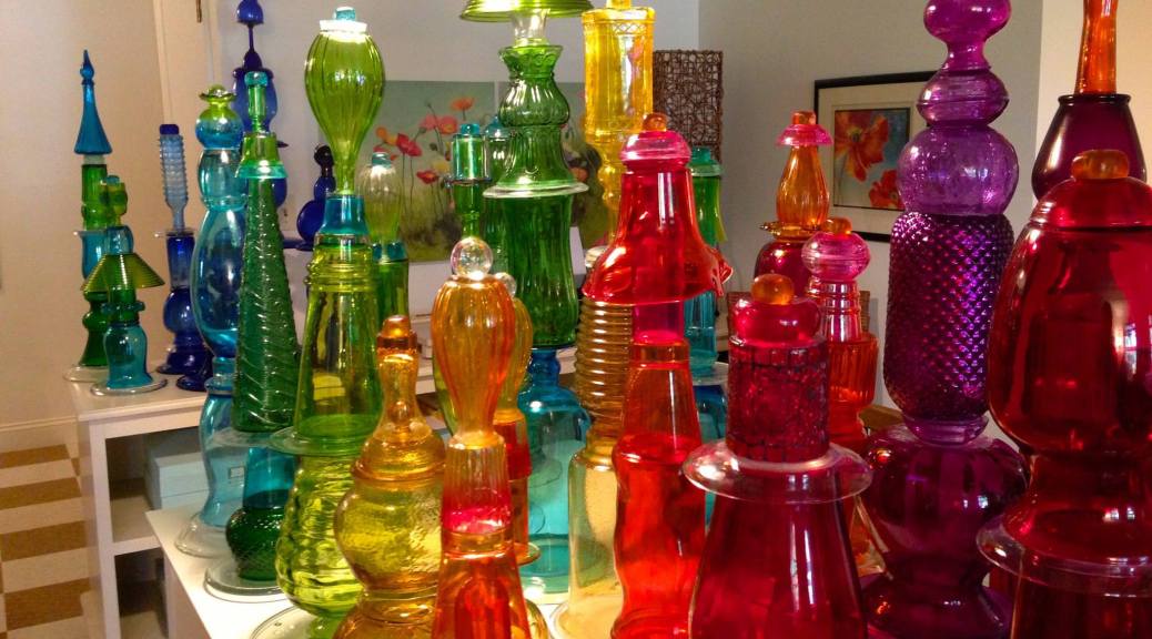 The fun comes in developing the stack. There’s a trick to stacking vases and jars and plates in an upward progression that makes the eye happy. I don’t always succeed…I’ve made quite a few that I think of as “dorky,” but I tend to just put those in the middle of a color clump and call it a day.